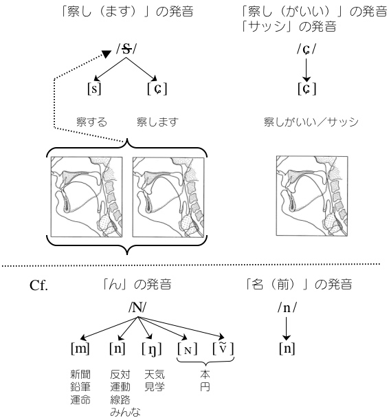 「察し(ます)」(動詞の連用形)と「察し(がいい)」(名詞)と「サッシ」(外来語)の「し」の子音の